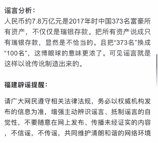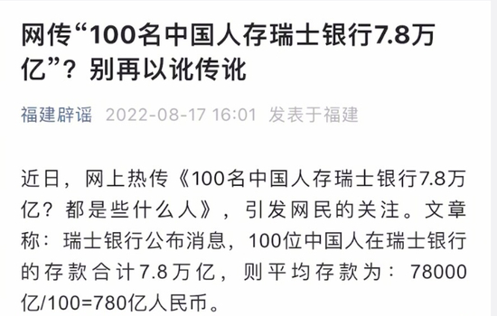 据福建辟谣,近日,网上热传《100名中国人存瑞士银行7.8万亿?都是些什么人》,引发网民的关注。文章称:瑞士银行公布消息,100位中国人在瑞士银行的存款合计7.8万亿,则平均存款为:78000亿/100=780亿人民币。