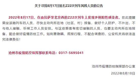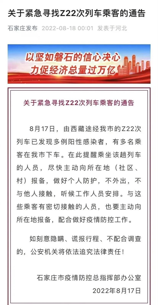 8月17日,由西藏途经石家庄的Z22次列车已发现多例阳性感染者,有多名乘客在石家庄北站下车。提醒乘坐该趟列车的人员,尽快主动向所在地(社区、村)报备,做好个人防护,不外出,不与他人接触,听候工作人员安排。与这些乘客有密切接触的人员,也要主动向所在地报备,配合做好疫情防控工作。