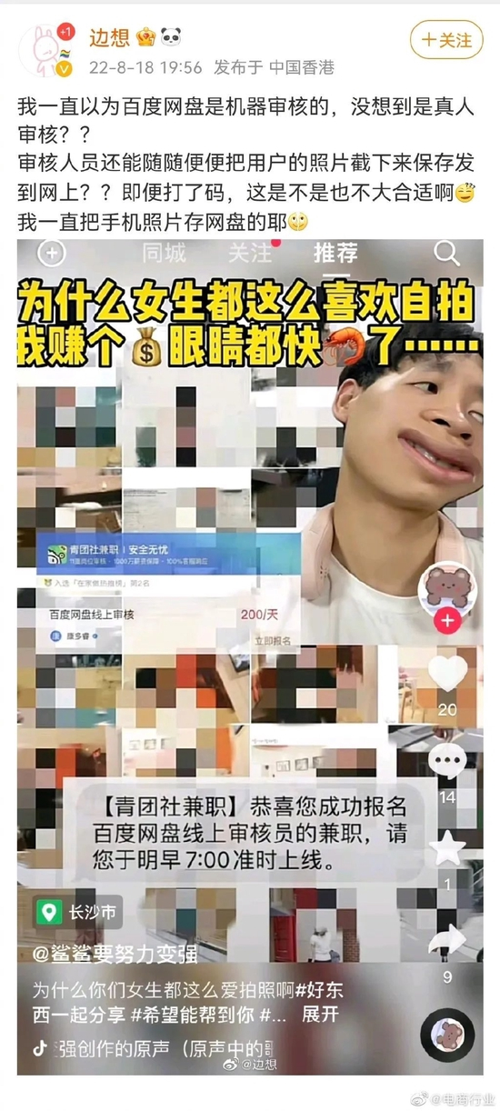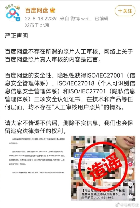 18日晚间,博主@边想 发帖质疑百度网盘用真人审核照片。@百度网盘 回应:不存在所谓的照片人工审核,网传内容是谣言。
