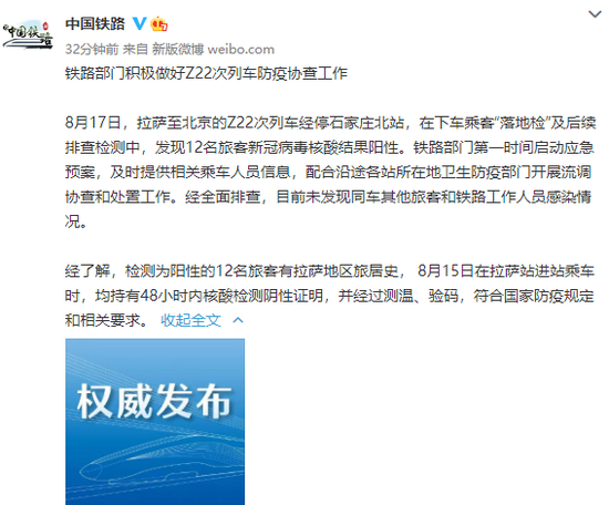 据“中国铁路”18日消息:8月17日,拉萨至北京的Z22次列车经停石家庄北站,在下车乘客“落地检”及后续排查检测中,发现12名旅客新冠病毒核酸结果阳性。经全面排查,目前未发现同车其他旅客和铁路工作人员感染情况。