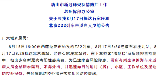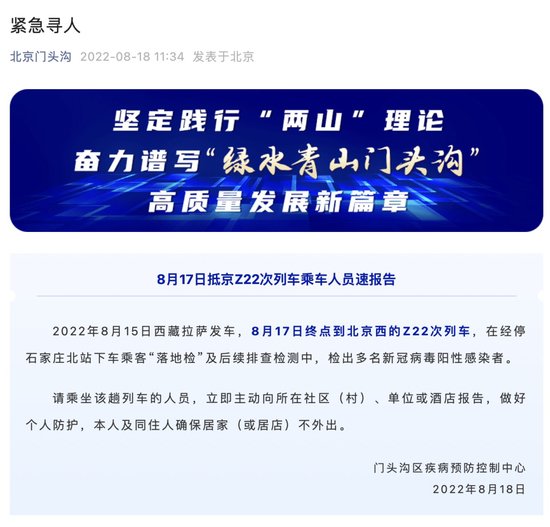北京门头沟:8月17日抵京Z22次列车乘车人员速报告