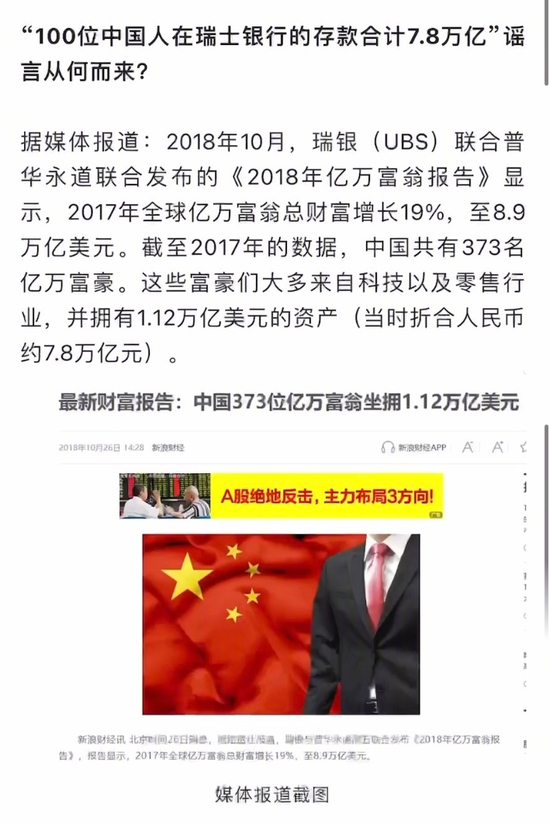 谣言分析:人民币约7.8万亿元是2017年时中国373名富豪所有资产,不仅仅是瑞银存款。把所有资产说成只有瑞银存款,显然是不恰当的。且把“373名”换成“100名”,这博眼球的意味更浓了。可见谣言就是这样以讹传讹制造出来的。