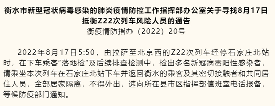 请乘坐本次列车在石家庄北站下车并返回衡水的乘客及其密切接触者和共同居住人员,全部居家隔离,不得外出,速向所在县市区指挥部值班室电话报备,等候防疫部门通知。