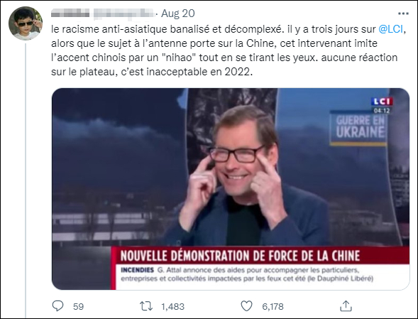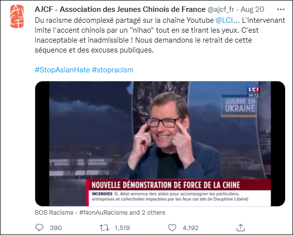 (观察者网讯)据多家法媒22日报道,近日,法国新闻台(LCI)一嘉宾在节目中用奇怪的口音模仿中国人说“你好”打招呼,又用双手拉起两只眼角,引发舆论批评。法国反种族主义组织SOS Racisme与法国华裔青年协会均对此表达抗议,谴责这是不可接受的种族主义行为,SOS Racisme还提请法国相关政府机构干预。