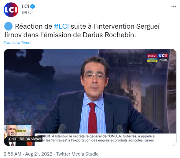 另外,据法国《费加罗报》21日报道,由于法国新闻台(LCI)节目主持人与工作人员当时没有对日尔诺夫做出反应或谴责,他们也受到了网民的批评,因此,当地时间20日,主持人罗彻宾在晚间节目中代表整个频道公开为此道歉。