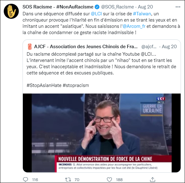 随后,法国反种族主义组织SOS Racisme在当天转发这条推文,宣布将此事提请法国视听和数字通信监管局(ARCOM)干预,并要求法国新闻台(LCI)“谴责这一不可接受的种族主义行为”。