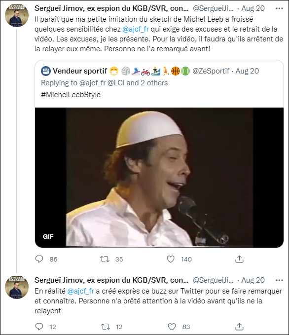 面对外界的批评,当地时间19日晚,日尔诺夫连发2条推文回应此事。他先是辩护称,自己只是在模仿喜剧演员米歇尔·里布(Michel Leeb),却没想到激怒了法国华裔青年协会,“我向他们道歉”。这样对自己的错误一笔带过后,日尔诺夫转而竟开始埋怨法国华裔青年协会将事情闹大,他声称节目视频此前没人注意到,是法国华裔青年协会“故意在推特上制造热议,以引起人们的注意”。