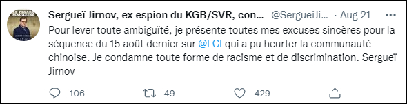 日尔诺夫的这番回应让网民感到愤怒,十几小时后,他再次发推,正式就此事作出道歉:“为了消除任何歧义,我对8月15日的LCI事件深表歉意,这可能会让华人社区感到冒犯。我谴责一切形式的种族主义和歧视。”