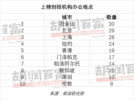 办公地点 上榜创投机构中有30家在旧金山有办公室,北京有29家,上海有26家,纽约有24家。