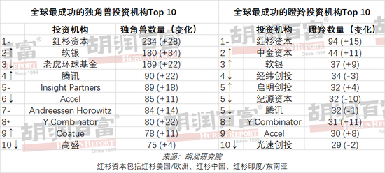 红杉资本在投资独角兽和瞪羚企业两方面都遥遥领先,软银、腾讯、Accel和Y Combinator这两方面都跻身前十。