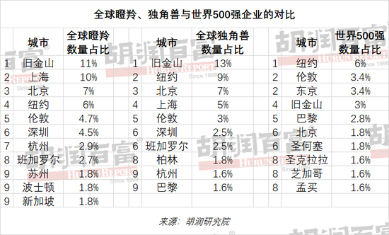 独角兽和瞪羚企业的规模代表着一座城市创新能力的高低和创业生态的完善度。“胡润全球独角兽榜”列出了全球成立于2000年之后,价值10亿美元以上的非上市公司。“胡润全球瞪羚企业”列出了成立于2000年之后、三年内最有可能达到独角兽级十亿美金估值的高成长性企业,这些企业目前估值一般在5亿至10亿美元之间。