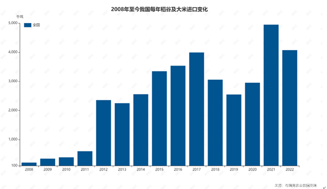 值得关注的是,今年大米进口量突破进口配额是大概率事件,中国自从2001年加入WTO以来,就开始对三大主粮执行进口关税配额管理。2004年至今,大米进口关税配额为532万吨。2021年,大米进口量496万吨。虽然进口量并未突破配额,但已近在咫尺。今年前8个月,大米累计进口456万吨,同比增42.5%。业内预计,今年大米进口量将达到600万吨水平。
