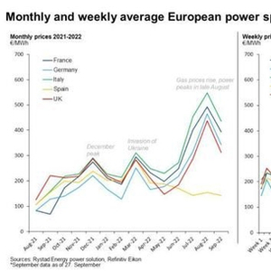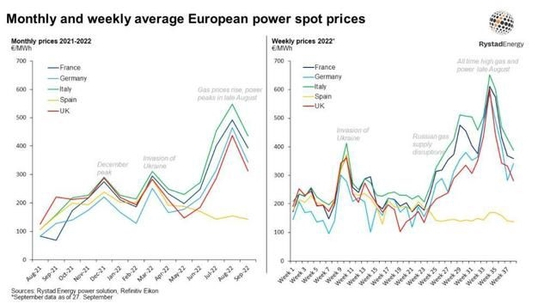 能源研究机构Rystad Energy提供给《每日经济新闻》记者的一篇报告中的数据显示,包括法国、德国、意大利、西班牙和英国在内的欧洲多国每月电价和每周电价在8月创下历史新高,9月价格有所下降。