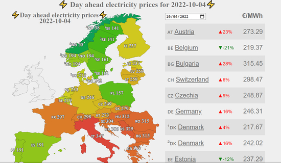 截至当地时间10月4日,欧洲各国的前日电力价格(day-ahead price)浮动如下: