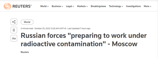 塔斯社提到,俄罗斯军方24日表示,俄罗斯国防部已准备好在放射性污染中执行任务。俄罗斯外交部长拉夫罗夫24日也提到了“脏弹”威胁,称俄方将在联合国提出该问题。