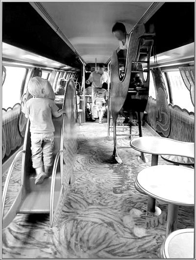 这个车厢的精彩之处主要是二层的一个游戏区。游戏区就是个车内小游乐场,有滑梯、攀爬架、小船和山洞,还铺着防摔的彩色地毯,车外的高饱和彩色卡通图案也延续到车厢内。这一截车厢座位不多,所有的桌上都印有桌游的面板。小一些的孩子可以在游戏区攀爬打滚,大的孩子可以在座位上玩桌游。查票的列车长到这一节车厢的时候会郑重其事地给每一个小朋友都发一张免费的卡通儿童票,拿出剪票夹给它们打孔。伯尔尼到苏黎世车程大约一小时,不少带小朋友的家长会选择这个家庭车厢,孩子上车以后鞋子一脱就扎到游乐区,家长只要坐在旁边看着就好。在这里不怕孩子吵闹到别的乘客,不少在火车上坐不住的孩子就这样玩着玩着就到站了。