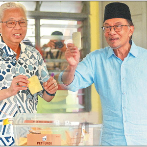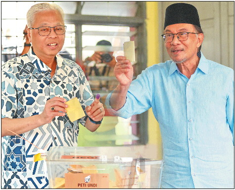 11月19日,国民阵线候选人伊斯迈尔(左)、希望联盟领导人安瓦尔参加大选投票。(拼版照片) 新华社发