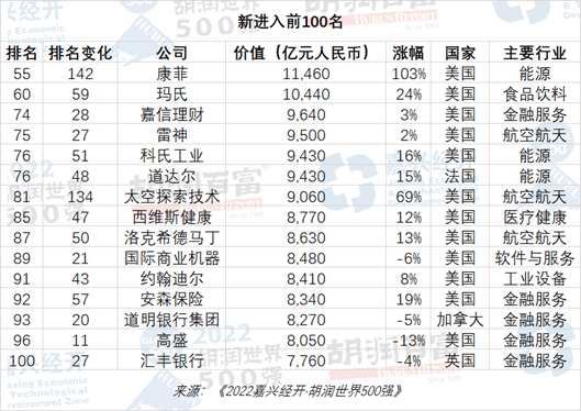 有15家企业新进入前100名,以能源公司康菲为首,其价值翻了一番,达到1.1万亿元,上升142位,排在第55位。埃隆·马斯克的SpaceX上升134位,排在第81位。武器制造商雷神和洛克希德马丁在俄乌冲突开始后价值上升。