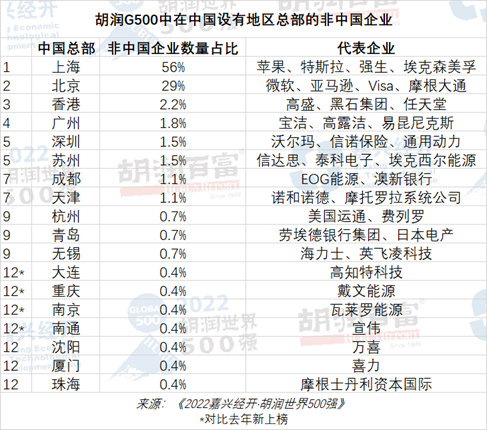 60%以上非中国的胡润G500企业在中国设有地区总部,其中六成在上海,三成在北京。