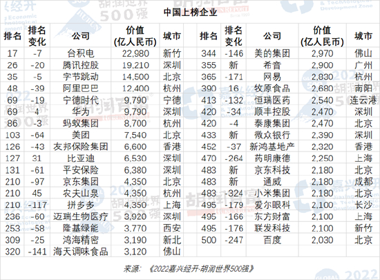 中国35家公司上榜,减少12家,总价值19万亿元。台积电价值2.3万亿元(下降44%)超过腾讯价值1.9万亿元(下降62%)