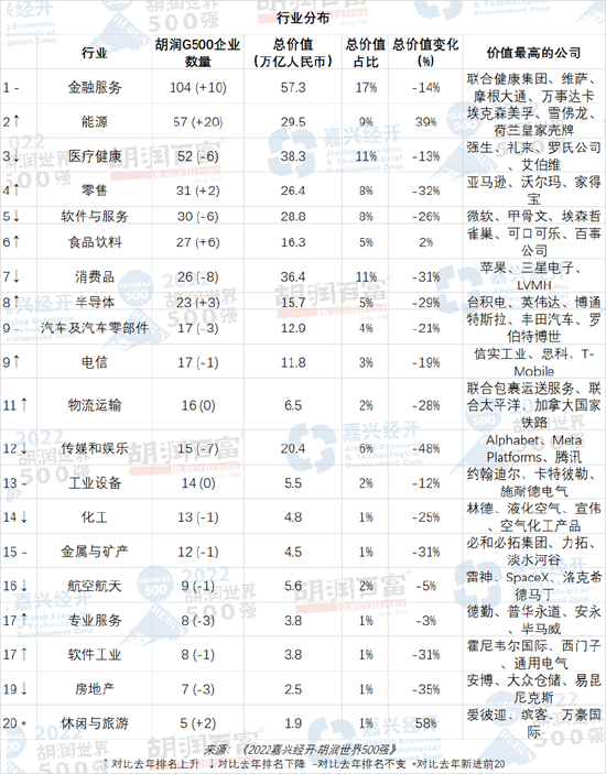 金融服务业是今年胡润G500中贡献最大的行业,有104家公司上榜,占榜单的21%;其次是能源行业,有57家公司上榜,跃居第二位,超过医疗健康行业。