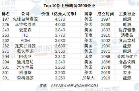 68家公司新进入胡润G500,其中美国能源公司先锋自然资源领先,以4,570亿元的价值直接跃居前200名。其中24家公司成立于2000年以后。
