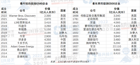 很多最年轻的公司都是由老牌公司合并成立,比如今年华纳兄弟与Discovery的合并。在前十家最年轻的公司中,只有中国的拼多多和微众银行,以及印度的Adani Green Energy是初创企业。