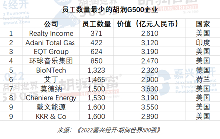 胡润G500企业在全球拥有4,300万员工,平均每家公司为8.67万人。94家公司的员工人数不足1万人。125家拥有超过10万名员工,其中沃尔玛拥有220万名员工,中国的鸿海精密(富士康母公司)拥有82.6万名员工。