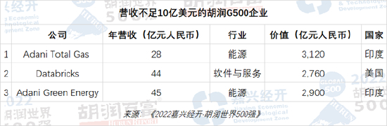 “有趣的是,很多胡润G500最有价值的公司,销售额都低得惊人。有3家胡润G500企业去年的销售额不到10亿美元。例如,总部印度的Adani Total Gas去年营收‘只有’28亿人民币,员工只有400多人,但价值却超过3100亿元。美国大数据独角兽Databricks去年的销售额‘只有’44亿人民币,但其价值却超过2700亿元。”