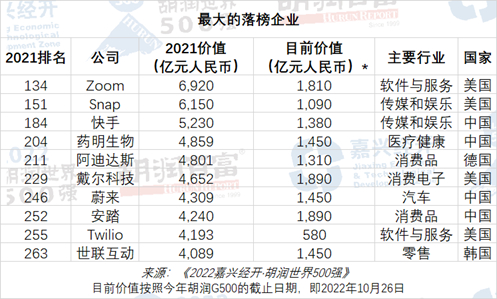 视频会议平台Zoom(去年价值6,920亿元,排名第134位)是最大的落榜者,其次是总部加州的Snap和总部北京的短视频平台快手。药明生物在今年2月被美国商务部列入“未经核实名单”后,价值下跌70%多。阿迪达斯在销售低迷、与“侃爷”Kanye West终止合作以及中国业绩表现不佳的背景下,一直举步维艰。戴尔股价下跌主要是因为剥离云计算软件制造商VMware 81%的股份(VMware以3,410亿元的价值位列胡润G500前300名)。蔚来由于收益不及预期,价值下跌73%。在国内疫情反复及消费疲软的大背景下,国内运动服品牌承担巨大压力,安踏价值下跌58%。