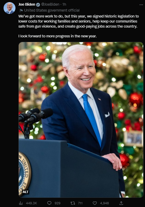 “我们还有很多工作要做,但今年,我们签署了历史性法案,降低了工薪家庭和老年人的(生活)成本,继续帮助我们的社区免受枪支暴力的侵害,并在全国各地创造了高薪就业机会。我期待在新的一年取得更大进步。”拜登称。