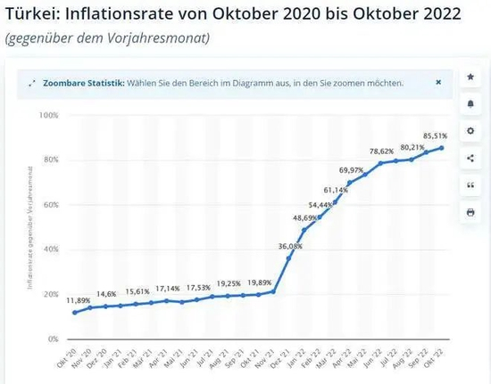 比如投资股市,所以土耳其股市去年暴涨190%。投资房地产,截止于2022年第三季度,土耳其房价暴涨189.2%。