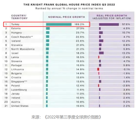 另一方面,房地产价格也是暴涨。数据显示,截止于2022年第三季度,土耳其房价以189.2%的惊人涨幅位居全球第一。