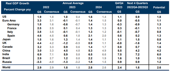 2023年全球及各国经济增速预测 来源:Bloomberg, Goldman Sachs