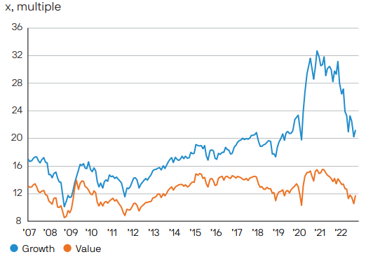 MSCI全球成长股和价值股前瞻市盈率 来源:MSCI;Refinitiv Datastream;J.P. Morgan