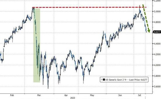 对利率前景更敏感的2年期美债收益率在亚市早盘曾接近4.74%刷新日高,后保持下行,美国PPI公布后先曾短线重上4.68%,后很快回到4.65%下方,美股盘中加速下降,午盘曾下破4.61%,刷新6月14日以来低位,日内降约14个基点,到债市尾盘时约为4.63%,日内降近12个基点,连降两日,且连续两日降逾10个基点,较上周四所创的2007年6月以来盘中高位回落近49个基点。