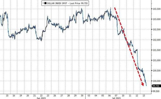 到周四美股收盘时,美元指数处于99.80下方,日内跌近0.8%,连跌六日,创2020年7月以来最长连跌日,六日内跌约4.5%,创去年11月以来最大的六日跌幅;追踪美元兑其他十种货币汇率的彭博美元现货指数跌近0.7%,连跌五日至去年4月初以来低谷。