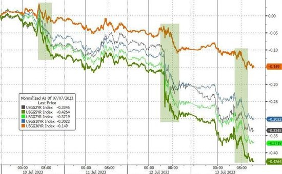 美国10年期基准国债收益率在欧股盘前曾接近3.87%刷新日高,欧美交易时段持续下行,美国PPI公布后降幅扩大,美股早盘下破3.80%,午盘曾降至3.76%下方,刷新6月29日以来盘中低位,日内降幅略超过10个基点,到债市尾盘时约为3.76%,日内降近10个基点,连降四日,较上周五刷新的四个月来高位回落超过30个基点。