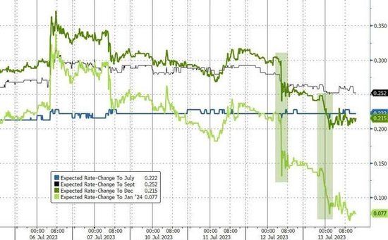 目前市场仍预计7月美联储将加息25个基点,但此后直到今年底都不会再加息,明年1月将降息。