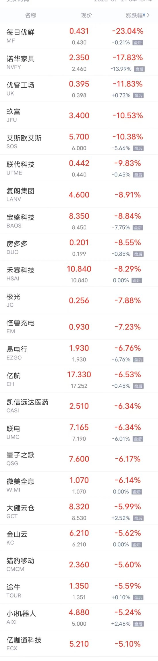 每日优鲜跌超23%,诺华家具跌超17%,优客工场跌超11%,玖富,艾斯欧艾斯跌超10%,联代科技跌超9%,复朗集团,宝盛科技,房多多,禾赛科技跌超8%,极光,怪兽充电跌超7%,易电行,亿航,凯信远达医药,联电,量子之歌,微美全息跌超6%,大健云仓,金山云,猎豹移动,途牛,小i机器人等跌超5%。