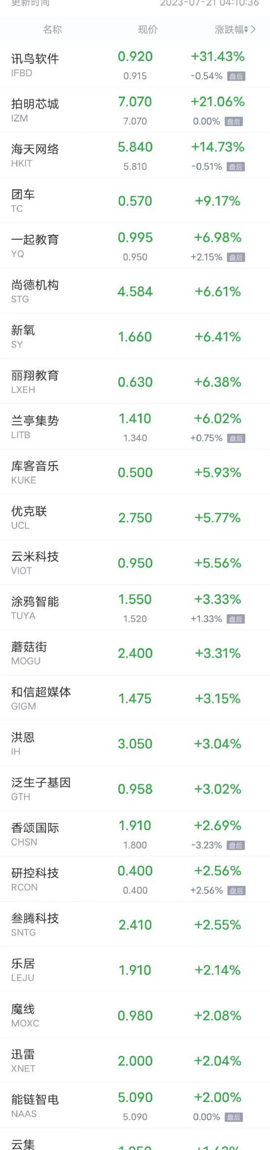 讯鸟软件涨超31%,海天网络涨超14%,团车涨超9%,一起教育,尚德机构,新氧,丽翔教育,兰亭集势涨超6%,库客音乐,优克联,云米科技涨超5%,涂鸦智能,蘑菇街,洪恩,泛生子基因涨超3%,和信超媒体,香颂国际,研控科技,叁腾科技,乐居,魔线,迅雷等涨超2%。