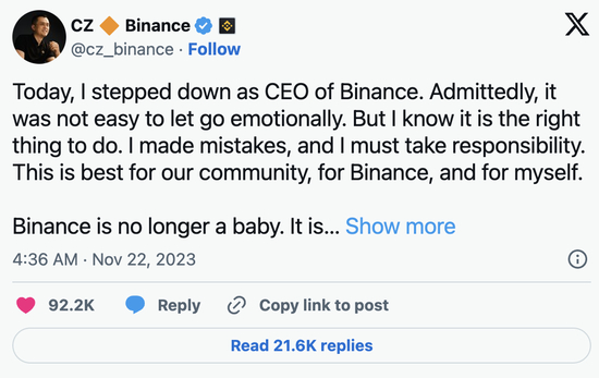 早些时候,根据美国司法部与币安达成的和解协议,币安及其CEO赵长鹏认罪,币安同意支付43亿美元的罚款,这是美国历史上最大的罚款之一。根据一项协议,赵长鹏将支付5000万美元的罚款,并辞去首席执行官的职务。