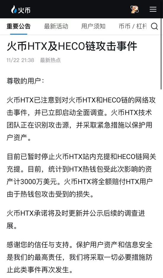 11月23日,HTX官网再次发布公告,重申将全额赔偿用户因上述事件蒙受的损失,并表示与平台总资金相比,此次损失的资金金额很小。此外,HTX表示,将在未来24小时内恢复存取款服务。