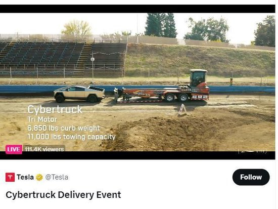 在活动中,Cybertruck的介绍语是“比卡车更实用,同时比跑车更快”。牵引力展示跑赢了福特F-150 Lighting电动皮卡、Rivian R1T电动皮卡,和福特F-350柴油皮卡。