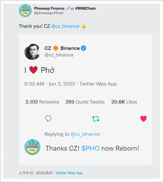 2022年3月,已经跑到越南、刚下飞机不久的赵长鹏发了一条推特,说他爱Phở(越南语中指河粉)。
