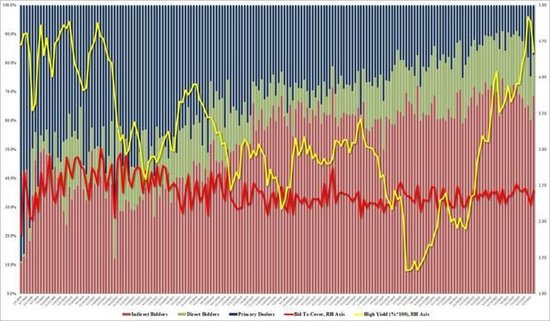 包括美联储和其他美国联邦政府实体在内,直接购买人获配17.3%,占比低于最近六次均值18.3%;承担直接和间接购买者未吸纳部分债券、避免流拍的一级交易商承揽14.23%,低于最近六次均值15.2%。