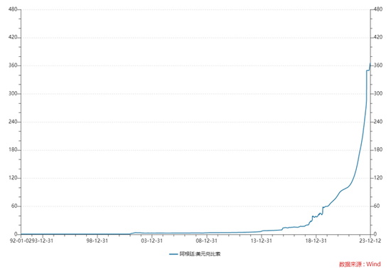 1992年至今的美元兑阿根廷比索汇率走势(截至12日最新下调前)。来源:Wind