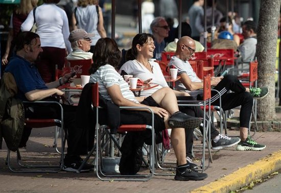人们在阿根廷首都布宜诺斯艾利斯的一处露天餐馆用餐。
