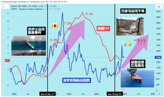 “这个事件也造成了一个深远影响,2021年2月美国年化CPI仅为1.7%,3月份跃升至2.6%。在BDI达到顶峰的10月份CPI为6.2%,但它并没有就此止步,美国CPI在2022年6月达到9.1%。当前情况,巴拿马运河干旱叠加胡塞武装红海袭击商船,苏伊士运河运输量占全球货运总量的12%,巴拿马运河的份额为5%。”黄劲文称。