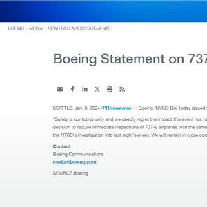 当地时间1月6日,波音公司在官网就737-9机型检查发布声明:“安全是我们的首要任务,我们对这起事件对其客户和乘客造成的影响深表遗憾。我们同意并完全支持美国联邦航空管理局(FAA)要求立即检查与受影响飞机配置相同的737-9机型的决定。